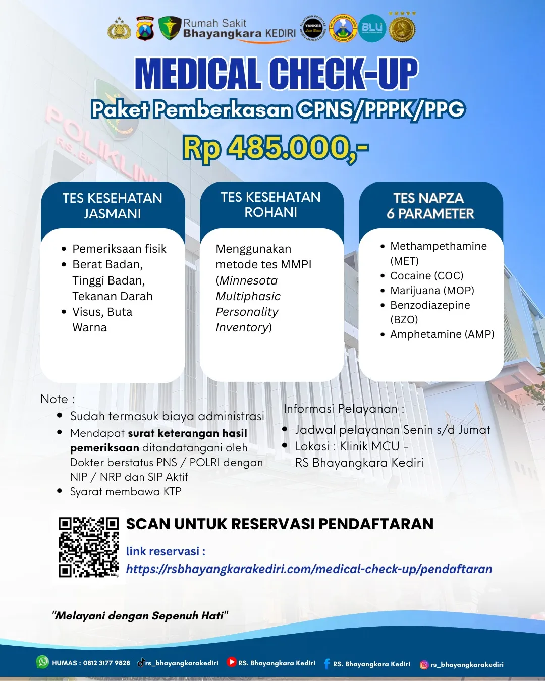 RS. Bhayangkara Kediri menyediakan paket medical check up untuk pemberkasan CPNS atau CPPPK, meliputi: